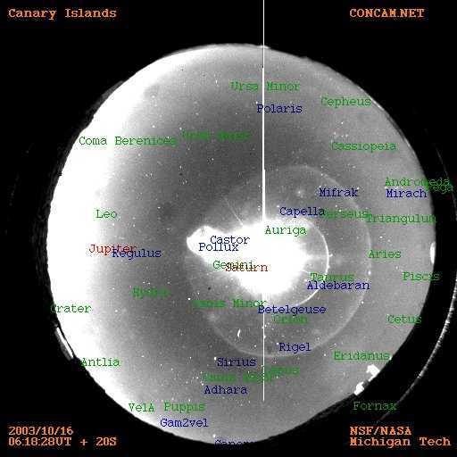 これはhttp://concam.net/rh/からである三つ組カナリア諸島の10月16日6時18分UTCに捕らえられたこの9時の位置の輝く物体に同様な位置に注目しなさい、イタリアで約1時間後の10月16日に撮られた集合体の位置に。 同じ物体か?、空が晴天であることに注意しなさい、星かせ見れる。ナンシー