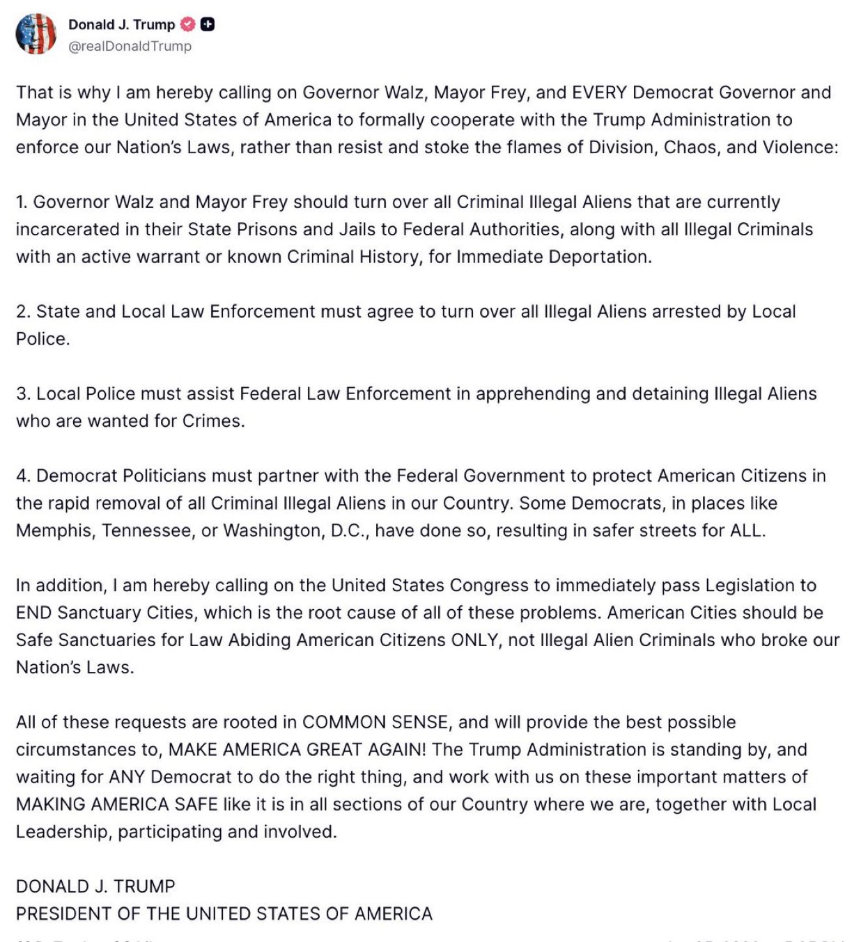 Trump: Gov. Walz, Mayor Frey Are 'Inciting Insurrection'