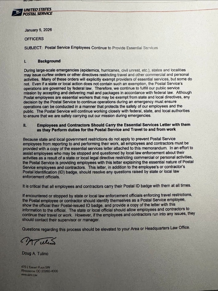 This is a letter given to all postal employees. It seems to be regarding some upcoming civil unrest. Is this real and preparing for a large event? [and from another] Trump Warns he May Go ‘Hard Way’ on Greenland January 10, 2026 https://www.rt.com/news/630777-trump-go-hard-greenland/The Greenland saga, which first caught the spotlight during Trump’s first term, has become a major source of tension between the US and European NATO members.Danish Prime Minister Mette Frederiksen has warned that any US military attack on another NATO country would mean “everything stops,” while leaders in Europe have stressed that “Greenland belongs to its people.” the US was mulling a plan to send each Greenlander between $10,000 and $100,000 to convince them to support America’s bid [and from another] Trump Eyes Striking Mexican Cartels January 9, 2026 https://www.thecentersquare.com/national/article_b27cd11c-6f1a-4f98-8d48-7eaf68afa89d.html The Trump administration has been busy carrying out over two dozen strikes on suspected narco-terrorists operating marine vessels in the Caribbean and eastern Pacific, leading up to last weekend’s massive air strikes on Venezuela and the capture of deposed Venezuelan President Nicolas Maduro. Sheinbaum has been intimidated by the cartels. Mexico has been accused of being a major passageway for the trafficking of the deadly drug fentanyl, among others. [and from another] Insurrection Act of 1807 https://en.wikipedia.org/wiki/Insurrection_Act_of_1807 The Insurrection Act of 1807 is the U.S. federal law that empowers the president of the United States to nationally deploy the U.S. military and to federalize the National Guard units of the individual states in specific circumstances, such as the suppression of civil disorder, of insurrection, and of armed rebellion. [and from another] What is the History Behind the Unofficial USPS Motto? https://uspsblog.com/how-is-new-york-city-related-to-famous-postal-quote/ While the Postal Service has no official motto, the popular belief that it does is a tribute to America’s postal workers. “Neither snow nor rain nor heat nor gloom of night stays these couriers from the swift completion of their appointed rounds”— is not the official Postal Service motto though it appears chiseled in gray granite over the entrance of the James A. Farley building at Eighth Avenue and 33d Street in Manhattan.